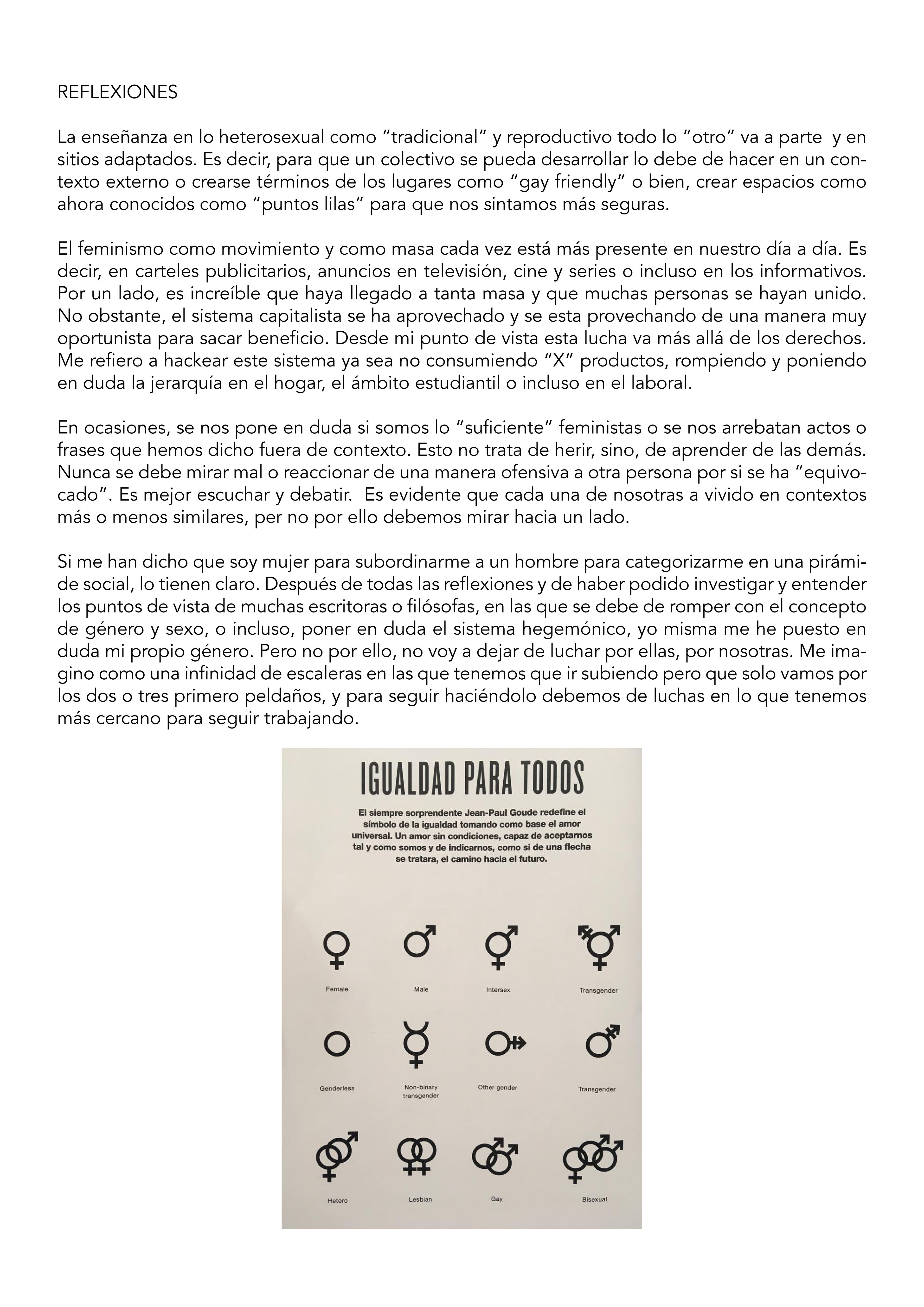 Si me han dicho que soy mujer para subordinarme a un hombre para categorizarme en una pirámide social, lo tienen claro. Después de todas las reflexiones y de haber podido investigar y entender los puntos de vista de muchas escritoras o filósofas, en las que se debe de romper con el concepto de género y sexo, o incluso, poner en duda el sistema hegemónico, yo misma me he puesto en duda mi propio género. Pero no por ello, no voy a dejar de luchar por ellas, por nosotras. Me imagino como una infinidad de escaleras en las que tenemos que ir subiendo pero que solo vamos por los dos o tres primero peldaños, y para seguir haciéndolo debemos de luchas en lo que tenemos más cercano para seguir trabajando.